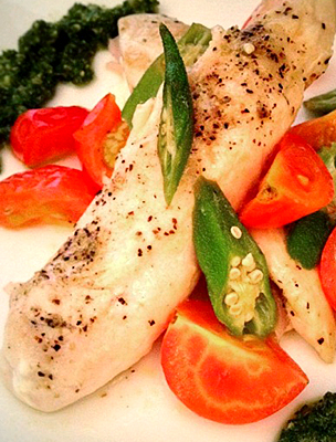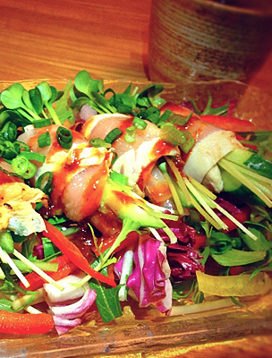 ヤムプラームックとは“いかの和え物”という意味のタイ料理で、ナンプラーをベースとした魚醤、レモン汁とすだちを加え、ちょっぴりスパイシーに、さっぱりと仕上げています。