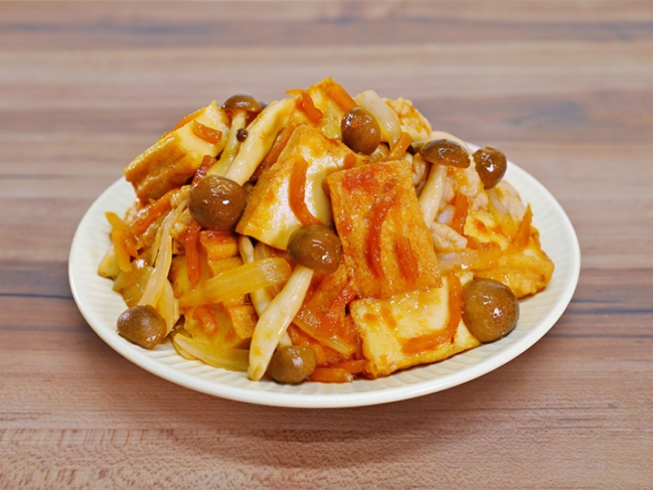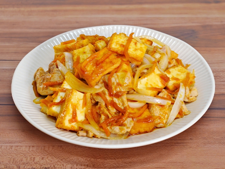 炒めた厚揚げと豚肉に、本品を加えて20秒ほどからめて焼くだけの簡単調理で、ボリューム満点の“楽うま”おかずがササッとできあがり。岩下の新生姜の爽やかな風味とシャキシャキ食感が際立ち、醤油、砂糖、黒酢をバランスよく合わせたしっかりとした味わいが食欲をそそります。