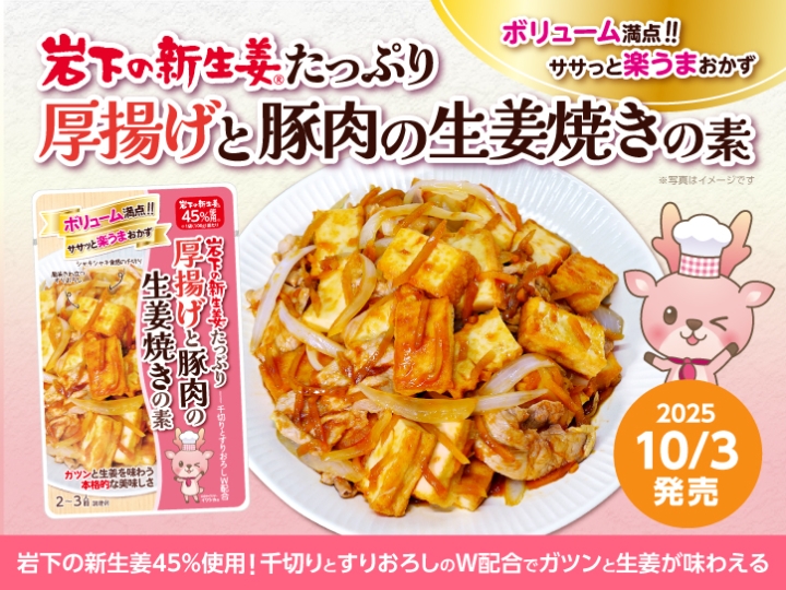 岩下食品株式会社(本社:栃木県栃木市、代表取締役社長:岩下 和了、以下 岩下食品) は、代表商品「岩下の新生姜®」を使用した新商品「岩下の新生姜たっぷり 厚揚げと豚肉の生姜焼きの素」を2025年10月3日に発売します。