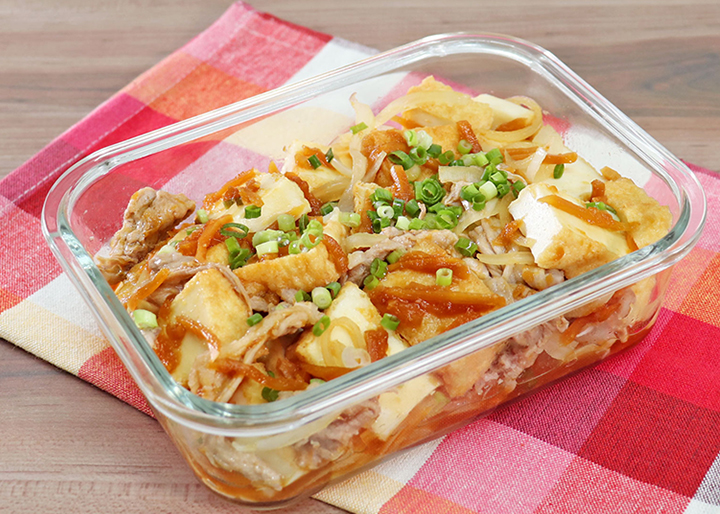 材料(2~3人前) | ・厚揚げ(厚さ1cmのひと口大)…1パック(200~300g) ・豚肉(こま切れ)…100g ・玉ねぎ(薄切り)…中1/2個 ・油…小さじ1 ・岩下の新生姜たっぷり 厚揚げと豚肉の生姜焼きの素…1袋 |