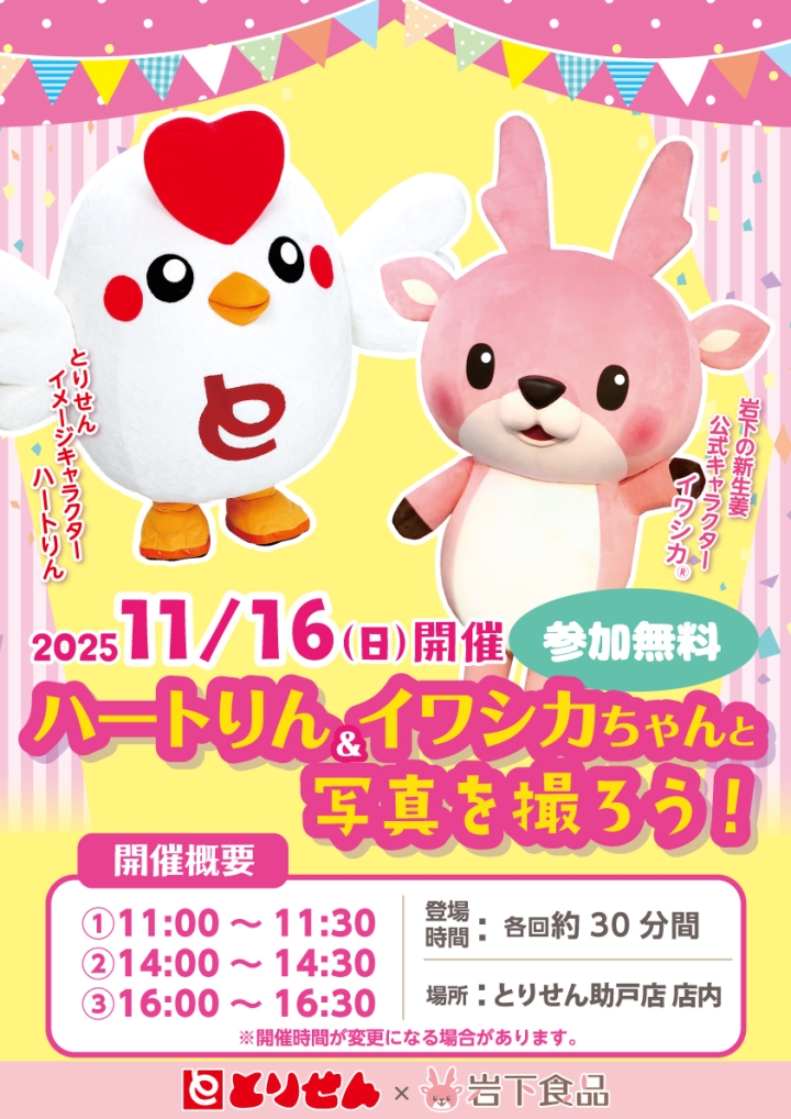 当日は、とりせんイメージキャラクター「ハートりん」も登場。ハートりんとイワシカちゃんは、①11:00 ②14:00 ③16:00の1日3回(各回約30分間)、店内でお客さまとふれあい、記念撮影を行います。