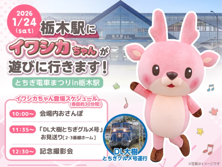 2026年1月24日(土)、岩下の新生姜公式キャラクター「イワシカ®」ちゃんが「とちぎ電車まつりin栃木駅」に遊びに行きます。