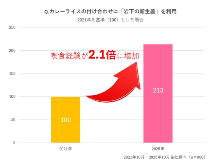 カレーの付け合わせといえば福神漬け、らっきょう漬けが定番ですが、実は3番目に多く食べられているのが生姜漬けです。生姜漬けは、さっぱりさせたい、口直し(箸休め)になる、食感がほしい、味を変えたい、彩りをよくしたい、などの理由で利用されており、カレーと岩下の新生姜の喫食経験は2021年から2025年までの4年間で2.1倍(2021年を100とした場合)に増加しています。