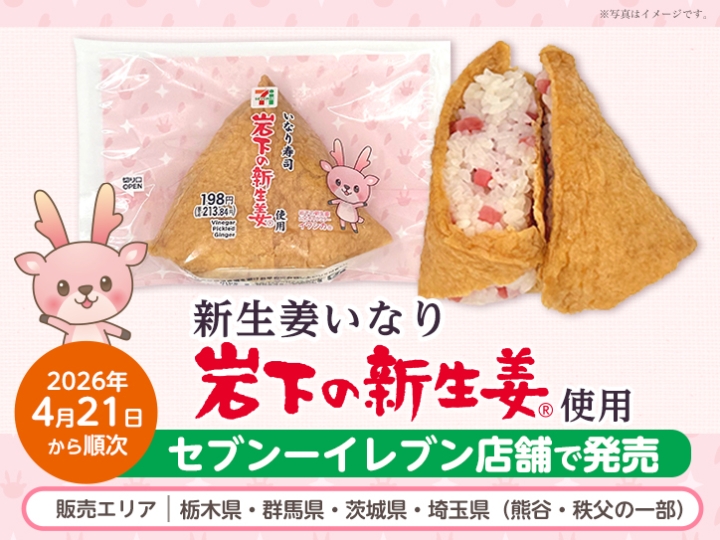 栃木県・群馬県・茨城県・埼玉県(熊谷・秩父の一部)のセブン‐イレブン店舗で、「新生姜いなり 岩下の新生姜使用」が2026年4月21日から順次発売されます。