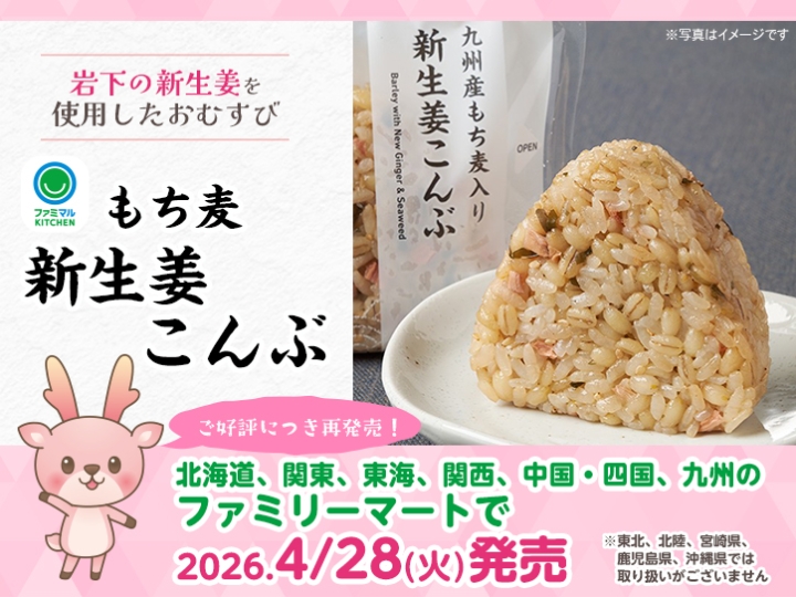 北海道、関東、東海、関西、中国・四国、九州のファミリーマート店舗(※宮崎県、鹿児島県を除く)で、岩下食品の「岩下の新生姜®」を使用したおむすび「もち麦 新生姜こんぶ」が2026年4月28日(火)に発売されます。2月に発売しご好評をいただいたことから、このたび再発売が決定しました。