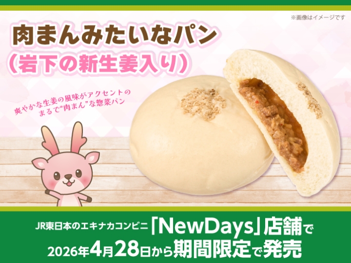 岩下食品の代表商品「岩下の新生姜®」を使用した惣菜パン、「肉まんみたいなパン(岩下の新生姜入り)」を第一屋製パンが製造、JR東日本のエキナカコンビニ「NewDays」店舗で2026年4月28日から期間限定で発売されます。お近くの販売店舗を是非ご利用ください。