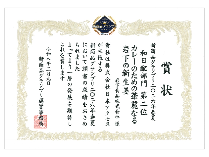 2026年3月5日発売の岩下食品の新商品「カレーのための華麗なる岩下の新生姜」が、株式会社日本アクセスが主催した「新商品グランプリ2026年春夏」和日配部門で第2位を受賞しました。