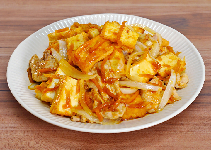 「岩下の新生姜たっぷり 厚揚げと豚肉の生姜焼きの素」を使ったレシピ。炒めた厚揚げと豚肉に、生姜焼きの素を加えて20秒ほどからめながら焼くだけの簡単調理で、ボリューム満点の“楽うま”おかずがササッとできあがり。