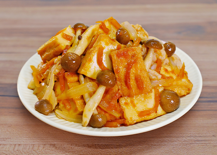 「岩下の新生姜たっぷり 厚揚げと豚肉の生姜焼きの素」を使ったレシピ。炒めたきのこ、厚揚げ、豚肉に、生姜焼きの素を加えて20秒ほどからめながら焼くだけの簡単調理で、ボリューム満点の“楽うま”おかずがササッとできあがり。