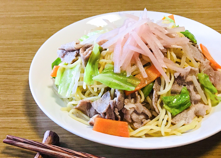塩焼きそば:1人前に粉末1/2包~具材によって調整、こしょうで味を調える
